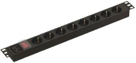 Hyperline SHT19-8SH-S-IEC Блок розеток для 19" шкафов горизонтальный 8 розеток Schuko выкл. с подсветкой вх. разъем IEC320 C14 10А 250В каб. пит. С13-С14 3м (3х1.0мм2) с вилкой IEC320 C14 в компл. 482.6x116.0x44.4мм (ШхГхВ) корпус алюминий черный
