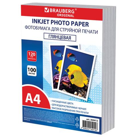 Фотобумага глянцевая, А4, 120 г / м2, односторонняя, 100 листов, ПАКЕТ, BRAUBERG ORIGINAL, 364412