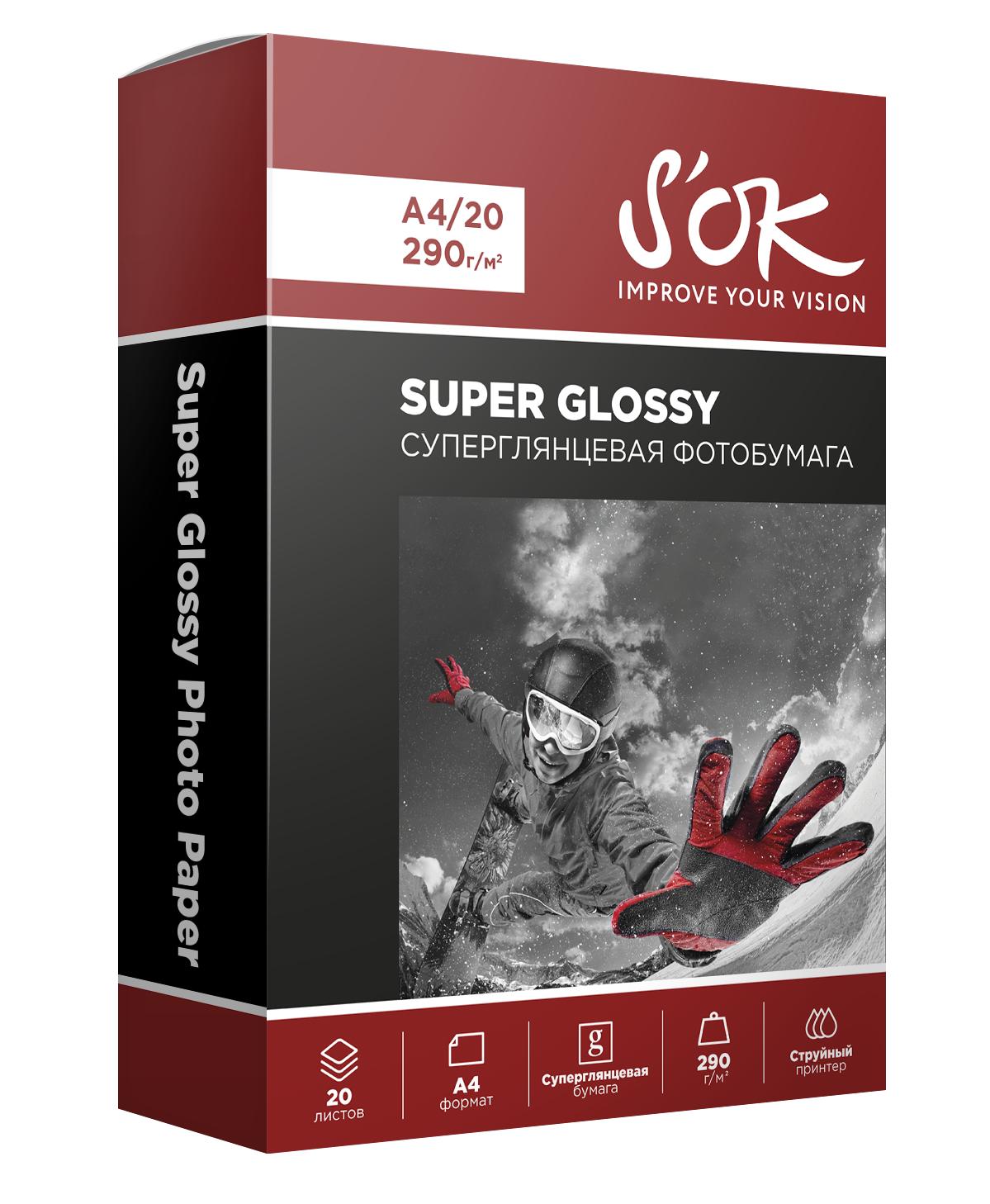 Фотобумага Premium S'OK суперглянцевая, формат А4, плотность 290г / м2, 20 листов
