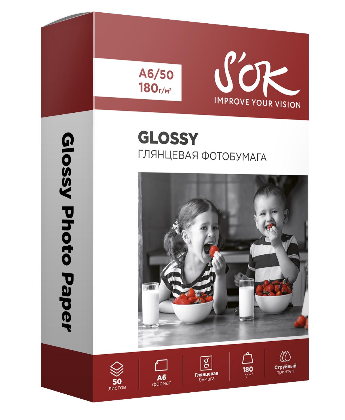 Фотобумага S'OK глянцевая, формат А6, плотность 180г / м2, 50 листов