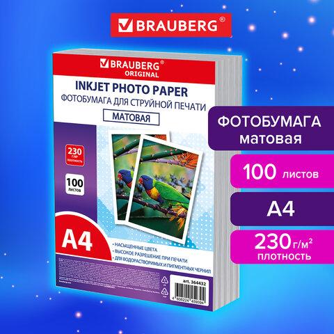 Фотобумага матовая, А4, 230 г / м2, односторонняя, 100 листов, ПАКЕТ, BRAUBERG ORIGINAL, 364432