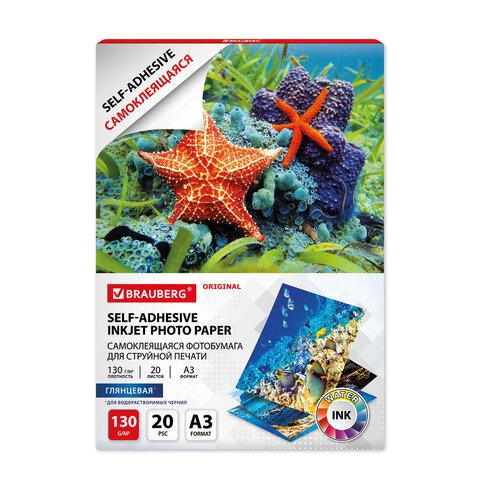 Фотобумага САМОКЛЕЯЩАЯСЯ глянцевая, А3, 130 г / м2, 20 листов, BRAUBERG ORIGINAL, 364008