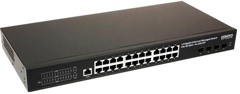 Коммутатор Gigabit Ethernet OSNOVO SW-24G4X-L2 Управляемый L2+ коммутатор Gigabit Ethernet на 28 портов. Порты: 24 x GE (10 / 100 / 1000Base-T) + 4 x 1G / 10G SFP+ Uplink. Консольный порт, Уровень управления L2+. Поддержка Jumbo Frame