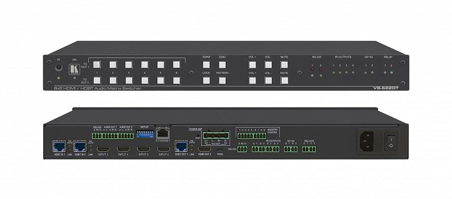 Матричный коммутатор Kramer Electronics VS-622DT х2 HDMI с деэмбеддированием звука, встроенным главным контроллером помещения и усилителем аудио; выходы на витую пару HDBaseT / HDMI, поддержка 4К60 4:2:0, поддержка PoE