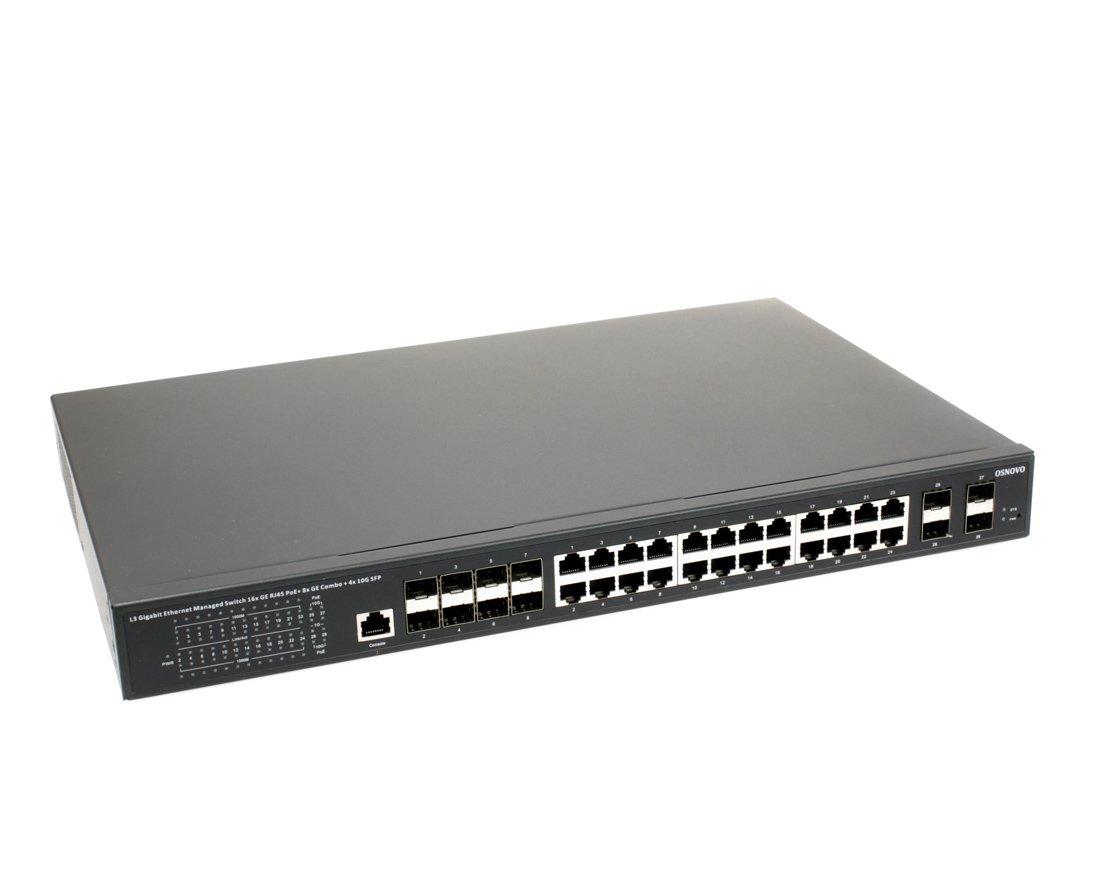Коммутатор / OSNOVO Управляемый L3 коммутатор Gb Ethernet на 16xGE RJ-45 + 8xGE Combo (RJ-45 + SFP) + 4x10G SFP+ Uplink. Уровень управления L3 (Full managed), 19" крепление в комплекте. Встроенная грозозащита 3kV.