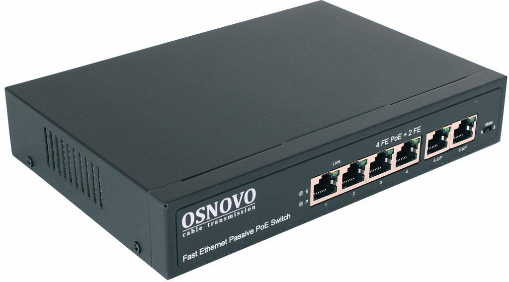 Коммутатор / OSNOVO Passive PoE коммутатор 6 портов, 4 PoE порта 10 / 100 Base-T, 2*10 / 100 Base-T Uplink, до 30W на порт
