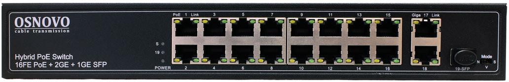 Коммутатор / OSNOVO PoE коммутатор FE, 16 *10 / 100 Base-T с PoE, 2 x GE Uplink (RJ45), 1 x GE SFP Uplink, мощность PoE на порт до 30W, суммарно PoE до 292W