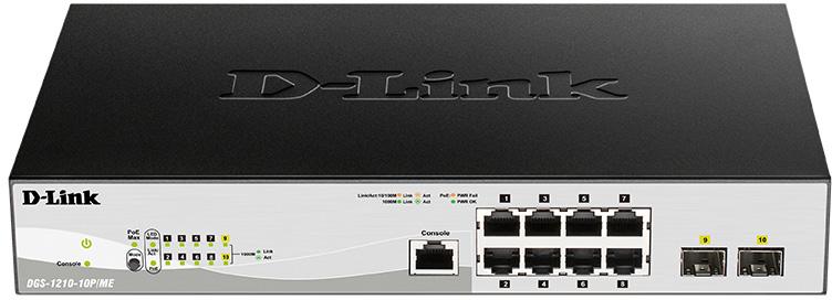 Коммутатор / DGS-1210-10P / ME / B Managed L2 Metro Ethernet Switch 8x1000Base-T PoE, 2x1000Base-X SFP, PoE Budget 78W, Surge 6KV, CLI, RJ45 Console, Dying Gasp