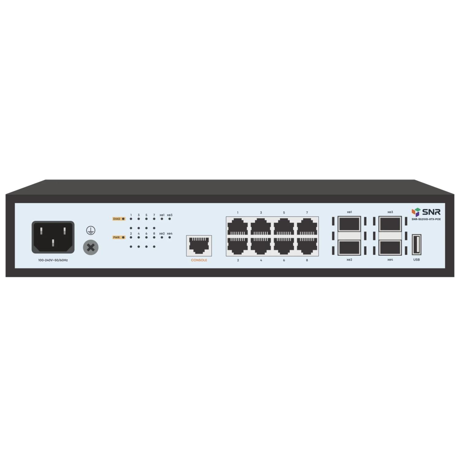 Коммутатор SNR Управляемый коммутатор уровня 2+, 8 портов 10 / 100 / 1000Base-T, 4 порта 1 / 10G SFP+, встроенный БП ~220V AC