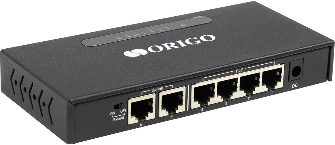 Коммутатор ORIGO Неуправляемый PoE-коммутатор, 6x100Base-TX (4x100Base-TX PoE), PoE-бюджет 60 Вт, PoE до 250 м, корпус металл
