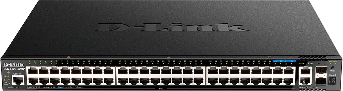 D-Link DGS-1520-52MP / A1A Управляемый L3 стекируемый коммутатор с 44 портами 10 / 100 / 1000Base-T, 4 портами 100 / 1000 / 2.5GBase-T, 2 портами 10GBase-T и 2 портами 10GBase-X SFP+ (PoE-бюджет 370 Вт)