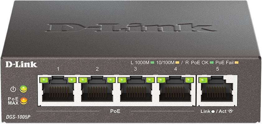 D-Link DGS-1005P / B3A Неуправляемый коммутатор с 5 портами 10 / 100 / 1000Base-T (4 порта PoE 802.3af / at, PoE-бюджет 60 Вт)