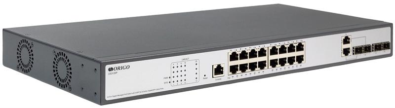 Коммутатор ORIGO Управляемый L2 PoE-коммутатор, 16x1000Base-T PoE, 2x1000Base-X SFP, 2xCombo 1000Base-T / SFP, PoE-бюджет 250 Вт, консольный порт RJ-45, комплект для установки в 19" стойку
