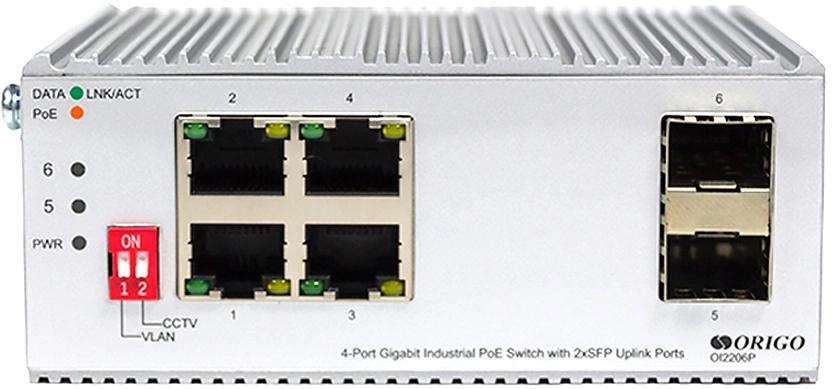 Коммутатор ORIGO OI2206P / 120W / A1A Промышленный конфигурируемый PoE-коммутатор, 4x1000Base-T PoE, 2x1000Base-X SFP, DIP-переключатель, PoE-бюджет 120 Вт, защита от статического электричества 6 / 8 кВ, -40..75°C