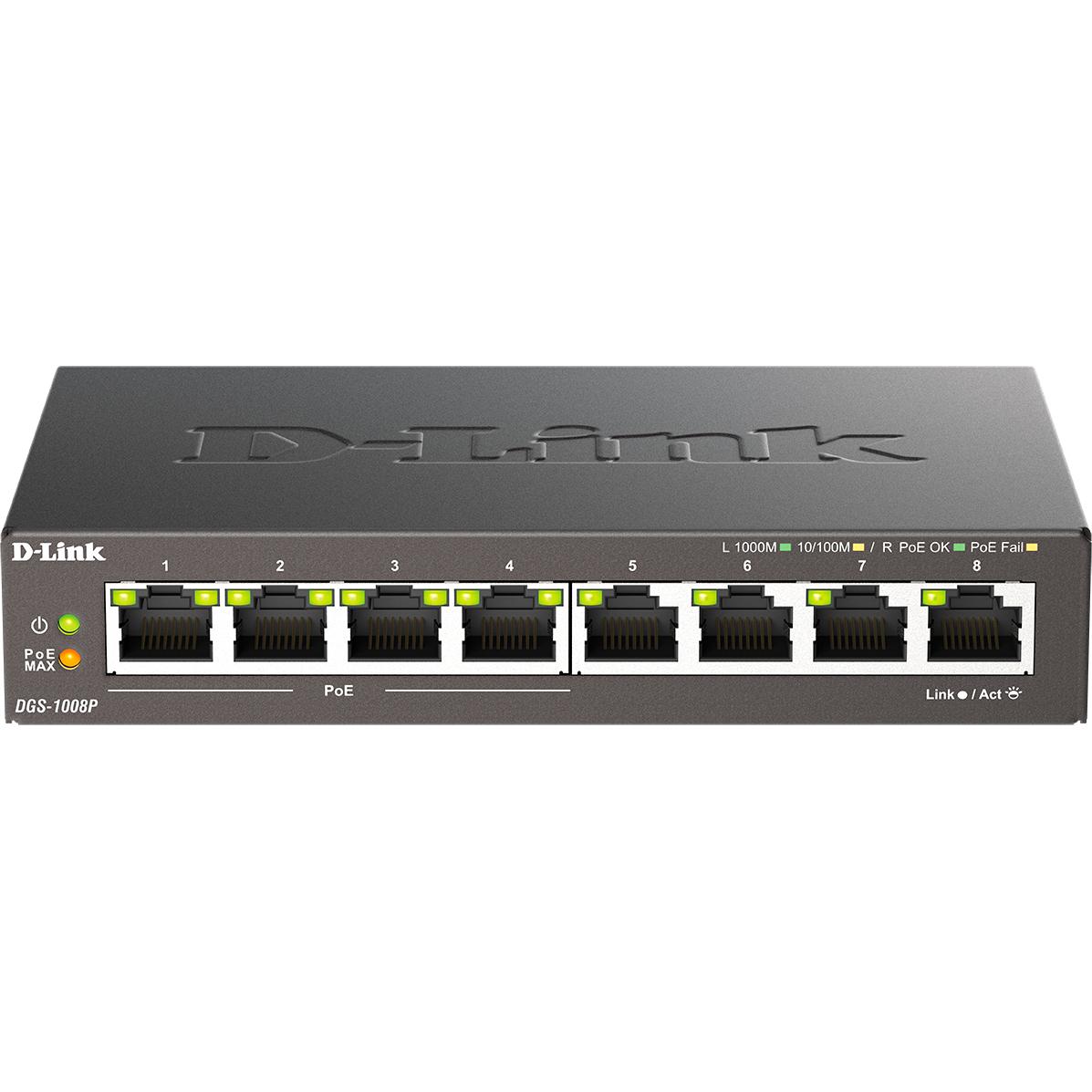 D-Link DGS-1008P / E1A Неуправляемый коммутатор с 8 портами 10 / 100 / 1000Base-T (4 порта PoE 802.3af / at, PoE-бюджет 80 Вт)