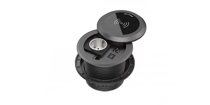 [WRTS-RR-B Custom] Лючок врезной в стол Wize Pro [WRTS-RR-B Custom] Состав: Розетка 230В -1, беспроводная зарядка моб.устройств, 3 отверстия для кабеля
