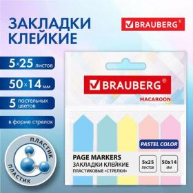 Закладки клейкие пастельные BRAUBERG MACAROON "СТРЕЛКИ" 50х14 мм, 125 штук (5 цветов х 25 листов), 115211