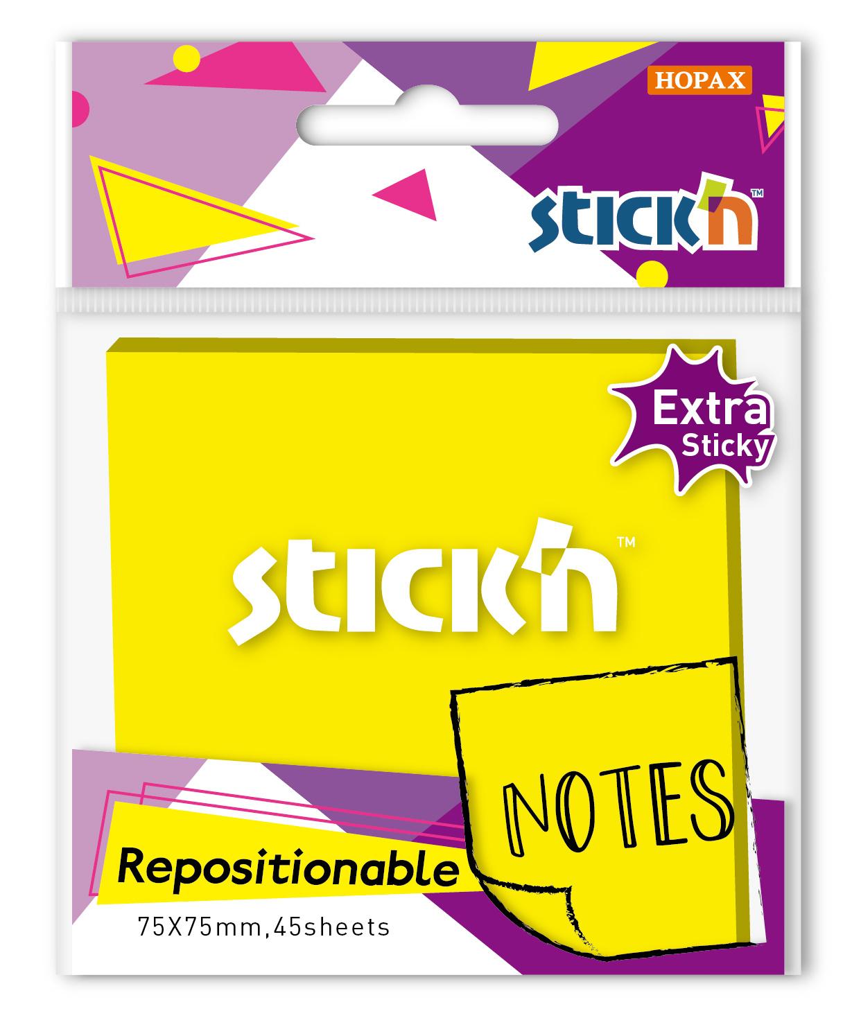 Блок самоклеящийся бумажный Stick`n 21580 76x76мм 45лист. желтый неон 1цв.в упак. усиленный клей