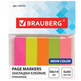 Закладки клейкие неоновые BRAUBERG бумажные, 50х14 мм, 250 штук (5 цветов х 50 листов), европодвес, 122731