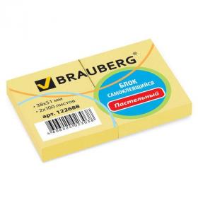 Блок самоклеящийся (стикеры) BRAUBERG, ПАСТЕЛЬНЫЙ, 38х51 мм, 100 листов, КОМПЛЕКТ 2 штуки, желтый, 122688