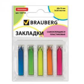 Закладки клейкие неоновые BRAUBERG, 48х10 мм, 100 штук (5 цветов х 20 листов), в пластиковом диспенсере, 122735