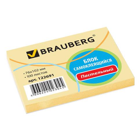 Блок самоклеящийся (стикеры) BRAUBERG, ПАСТЕЛЬНЫЙ, 76х102 мм, 100 листов, желтый, 122691