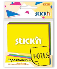 Блок самоклеящийся бумажный Stick`n 27083 76x76мм 80лист. 70г / м2 неон ассорти 4цв.в упак.