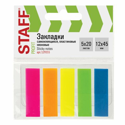Закладки клейкие неоновые STAFF, 45х12 мм, 100 штук (5 цветов х 20 листов), на пластиковом основании, 129355