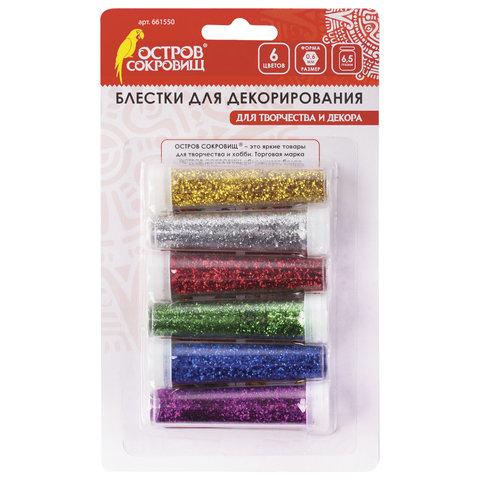 Блестки (глиттер) для декора, поделок, DIY, творчества, оформления, ОСТРОВ СОКРОВИЩ, НАБОР, 6 цветов по 6,5 грамм, блистер, 661550