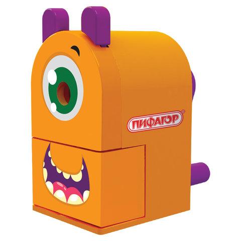 Точилка механическая ПИФАГОР "Монстрик", корпус оранжевый, для чернографитных и цветных карандашей, 228477