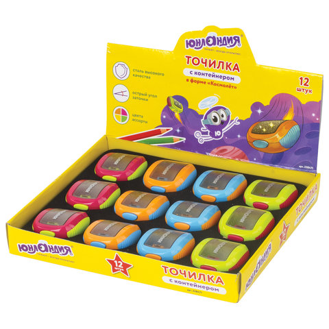 Точилка ЮНЛАНДИЯ "Звездолет Юнландика", с контейнером, пластиковая, корпус ассорти, 228471