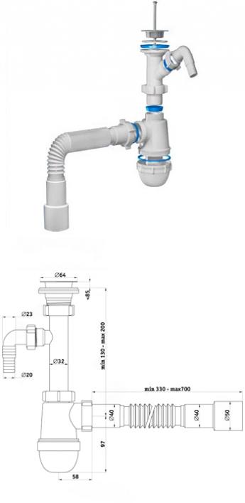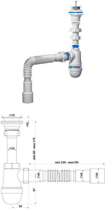 Сифон АНИ 1 1 / 4 х 32 (DB5316) с гибкой трубой 32х40 / 50 смещенный прямоточный с отводом д / СМ (для умывальника мебельн.)
