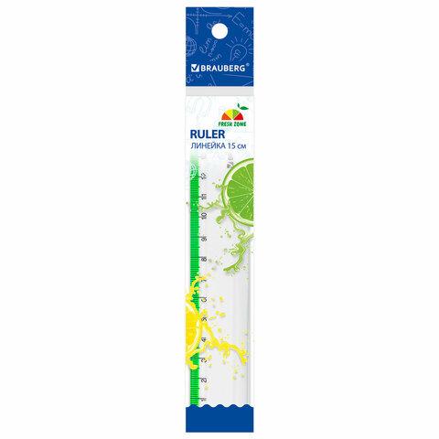 Линейка пластиковая 15 см BRAUBERG "FRESH ZONE", прозрачная, с салатовой шкалой, 210748