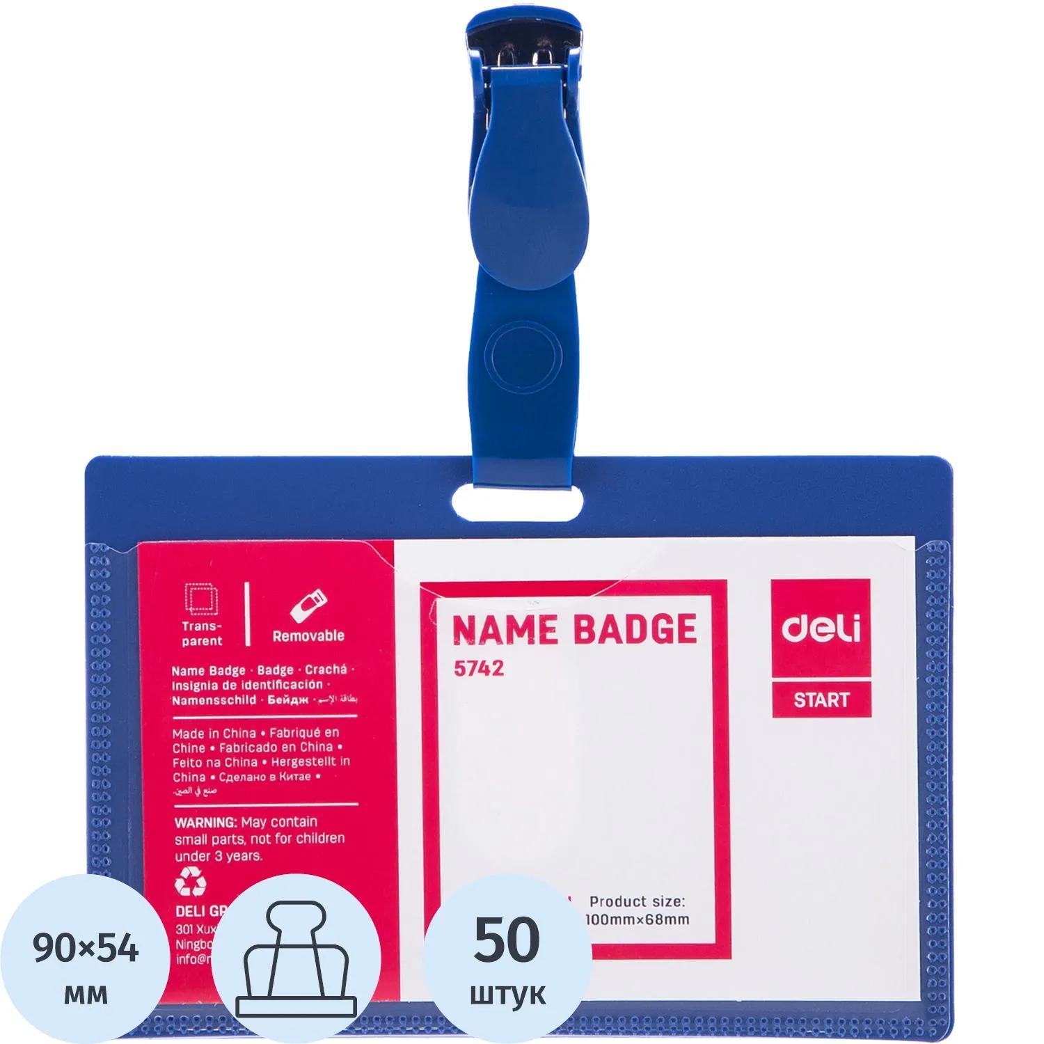 Бейдж Deli E5742 54х90мм горизонт. зажим вращающийся PP синий (упак.:50шт)