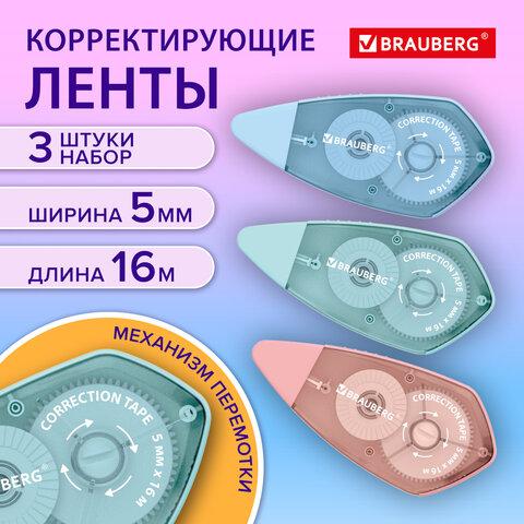 Корректирующая лента BRAUBERG REWIND, 5 мм х 16 м, ВЫГОДНАЯ УПАКОВКА 3 штуки в блистере, механизм перемотки, 272491