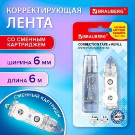 Корректирующая лента BRAUBERG 360°, 6 мм х 6 м + сменный картридж, корпус синий, блистер, 272661