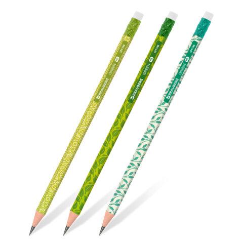 Карандаш чернографитный BRAUBERG "GREEN", 1 шт., HB, с ластиком, пластиковый, ассорти, 181746