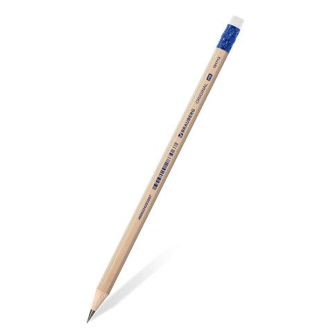 Карандаш чернографитный BRAUBERG "ORIGINAL", 1 шт., HB, с ластиком, некрашеный корпус, 181713