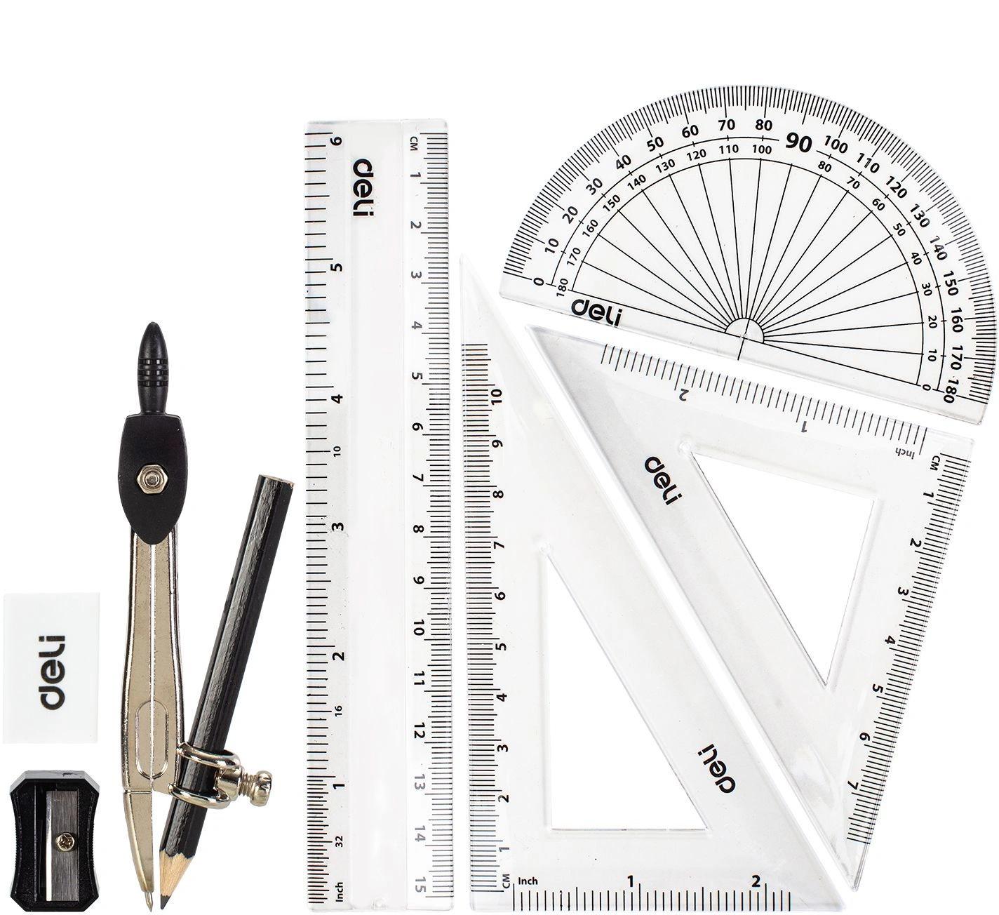 Набор для черчения Deli EG30695 в компл.:циркуль / карандаш / кронциркуль / линейка 15см / 2 треугольника / транспортир / ластик / точилка