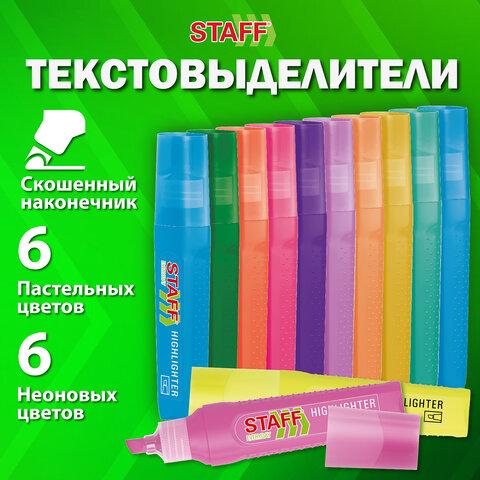 Набор текстовыделителей 12 ЦВЕТОВ, STAFF EVERYDAY HL-707, 6 неоновых цветов + 6 пастельных цветов, линия 1-5 мм, скошен. наконечник, 152552