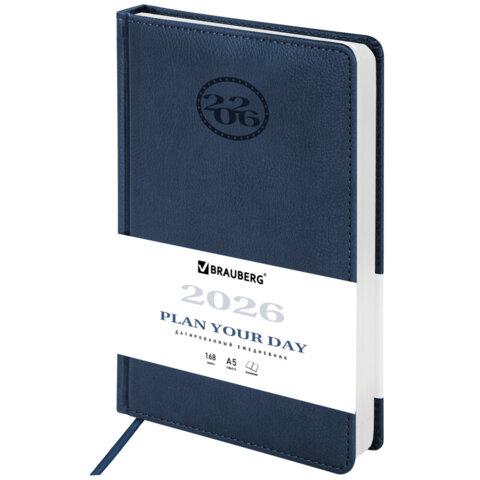 Ежедневник датированный 2026, А5, 138x213 мм, BRAUBERG "Favorite", под кожу, темно-синий, 117036
