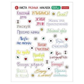 Наклейки бумажные, мотивирующие фразы и пожелания, НАБОР 4 листа, 137 наклеек, HATBER, 4Н6н