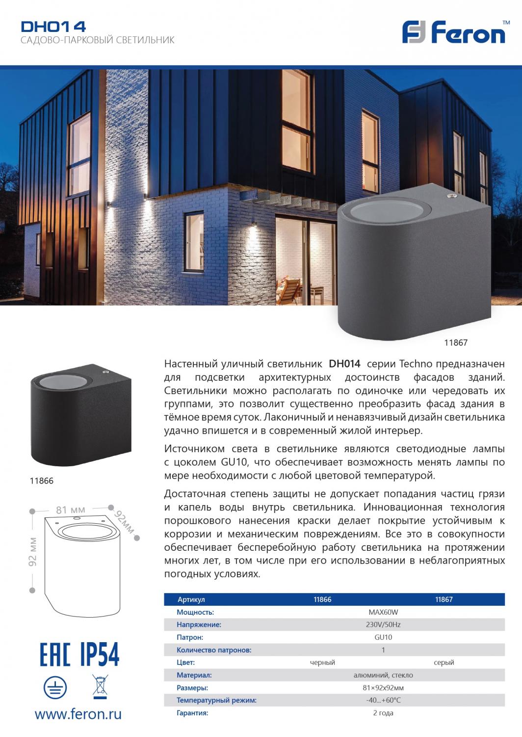 Светильник садово-парковый, серии «Бостон», (ДБУ) FERON DH014 GU10, 230V, IP65, цвет серый, на стену , 78*68*100мм