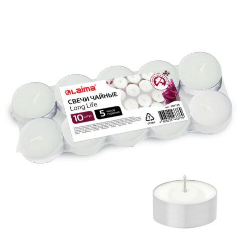 Свечи чайные Long Life, до 5 часов горения, вес 12 г, КОМПЛЕКТ 10 шт., в гильзе, LAIMA, 609199