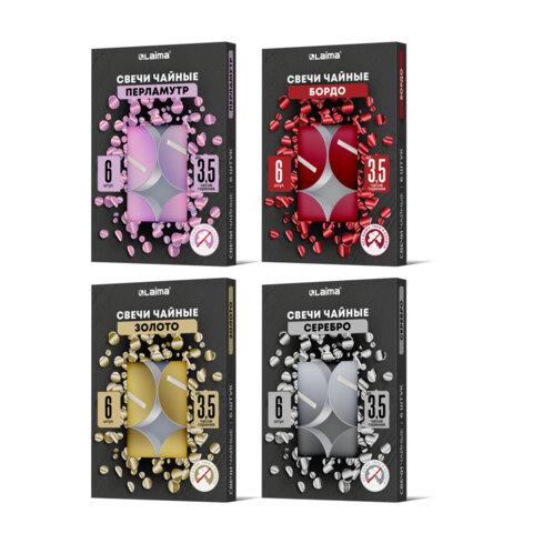 Свечи чайные цветные в гильзе КОМПЛЕКТ 6 штук, до 3,5 часов горения, ассорти 4 цвета, LAIMA, 609978