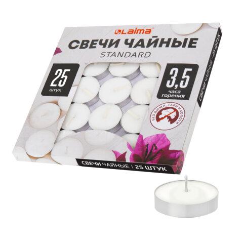 Свечи чайные Standard, до 3,5 часов горения, вес 9 г, КОМПЛЕКТ 25 шт., в гильзе, LAIMA, 609196