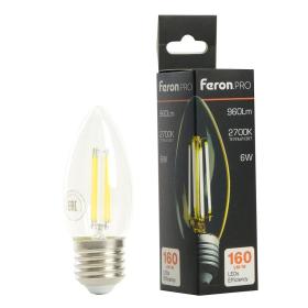 Лампа светодиодная филамент FERON LB-1206, C35 (свеча), 6W 175-265V E27 2700К (белый теплый), рассеиватель прозрачный 960Lm, угол рассеивания 270°, 92*35мм
