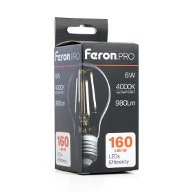 Лампа светодиодная филамент FERON LB-1106, A60 (шар), 6W 175-265V E27 4000К (белый), рассеиватель прозрачный 980Lm, угол рассеивания 270°, 105*60мм