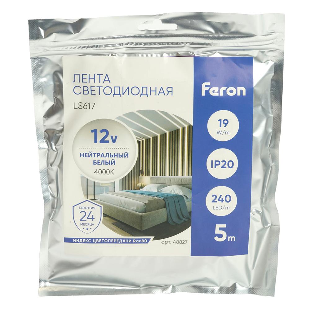 Лента светодиодная 12V FERON LS617, 240*SMD2835 , 19W / m, IP20, 4000К (нейтральный белый), Кратность резки мм 12.5мм, 5000*10*1.22мм