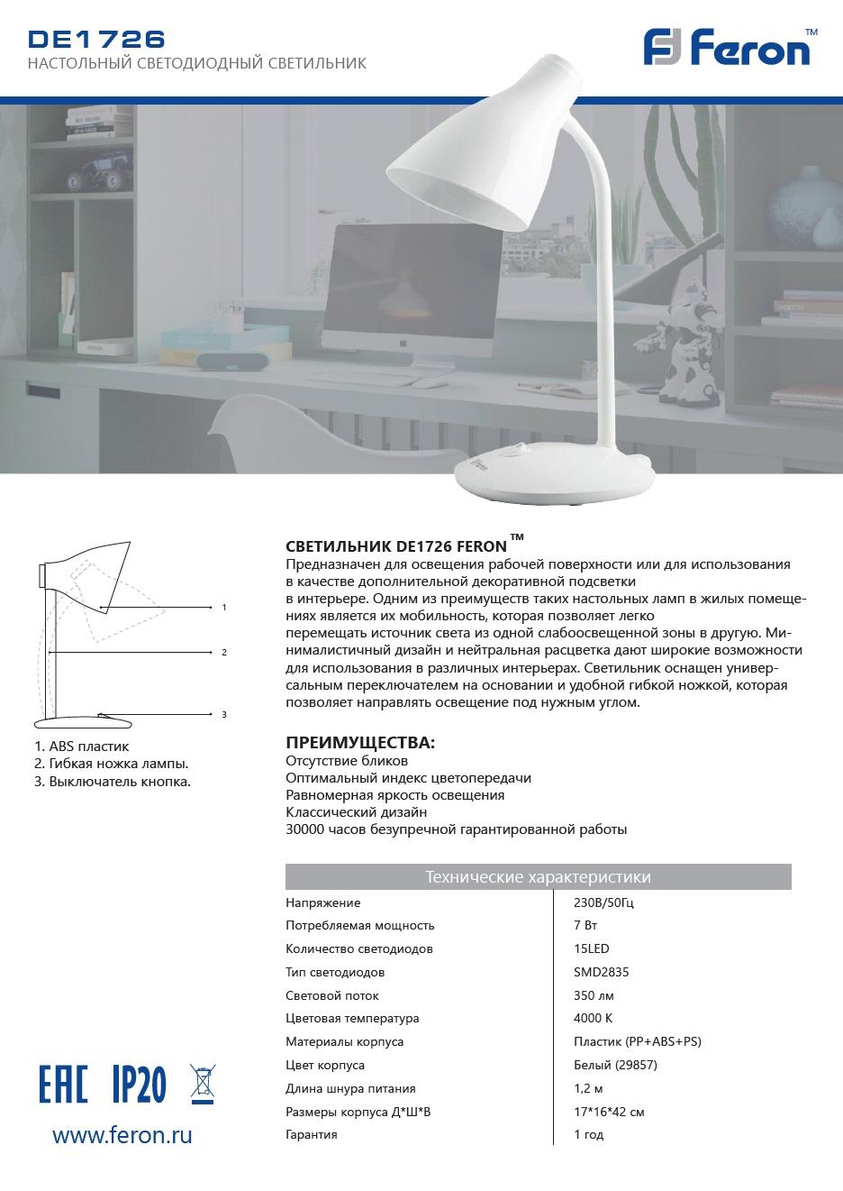 Светильник настольный светодиодный , гибкий рожок (ДНБ) FERON DE1726, белый, 7W, 100-240V, 15LED, 350Lm, 4000К (белый), материал пластик (PP+ABS+PS), в комплекте сетевой шнур, 160*170*420мм